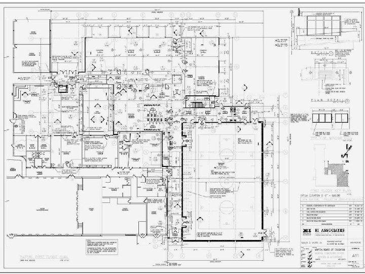 Phase 3 finished Finally, detailed dimensions are added to the drawings. These dimensions should locate all interior features. l Note that areas that will be drafted as enlarged plans are dimensioned only on their perimeters. More detailed dimensions for these areas will be included on the enlarged plans. l Also note that dimension strings consistently tie into column centerlines. l