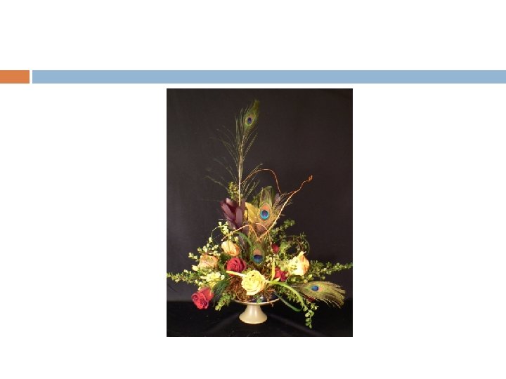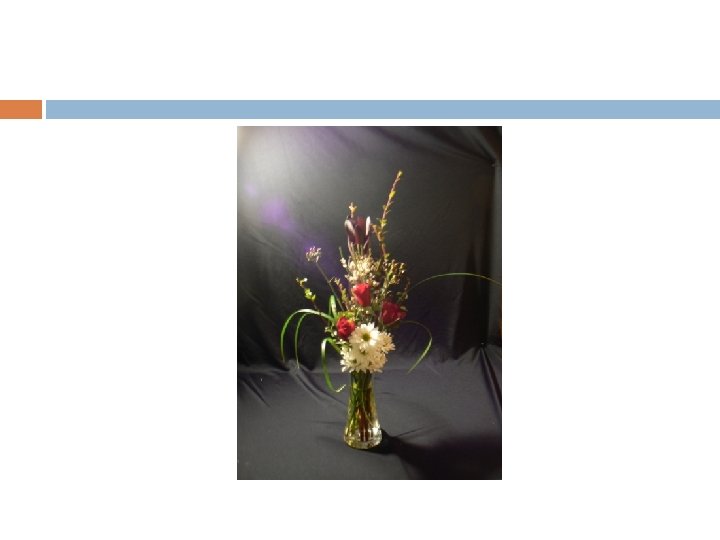 General Floral Design Rules Proper dimensions for floral designs are 1 1/2 to 2 times the greatest dimension of the container (height or width, whichever is greater) Buds and smaller flowers should be at the top and outer edge of the arrangement. Larger flowers should be placed lower and more toward the center. Lighter colors should be placed towards the top and darker colors toward the base. When using 12 flowers or less, use an uneven number of flowers to achieve visual balance (not including filler material). The ultimate size of an arrangement is limited by the size of stems, flowers, and surroundings. Never let the mechanical aids of the arrangement show (wires, tape, foam, or any other supports). Begin an arrangement with the shape in mind. Place outer perimeter flowers to establish shape. Fill in center.