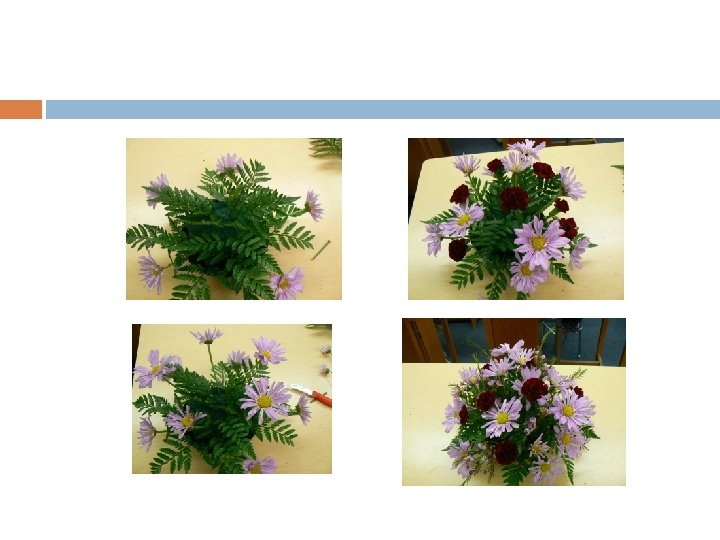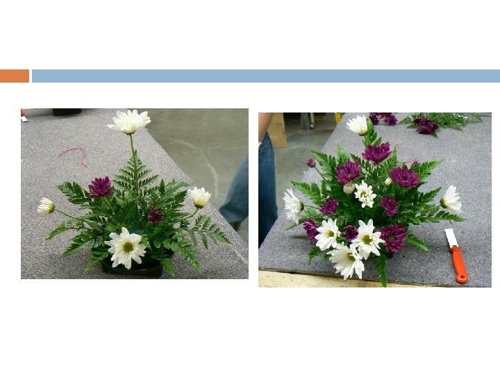Equilateral triangle arrangement Equilateral triangle arrangement (one sided) Soak floral foam. Place 1/3 brick of foam in gripper. Cover foam with greenery. Place outer perimeter flowers in triangle shape. Add in rest of flowers to fill inside triangle. Add statice to fill in holes. Equipment: Equilateral triangle arrangement Wet floral foam 1/3 brick gripper Sharp floral knife 2 stems chrysanthemums 3 stems of leather leaf 1 -2 stems of statice