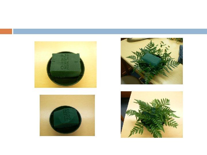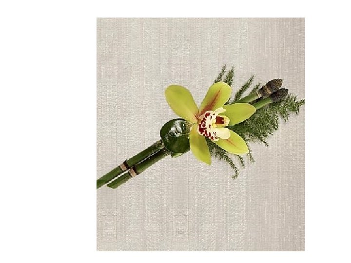 Line (Heaven, man, earth) Line Design Soak floral foam. Place 1/3 brick foam in gripper. Place flowers in Heaven, man, earth positions. Place a few pieces of leather leaf. Cover foam with wet sheet moss. Use greening pins to hold sheet moss in place. Equipment: Line design Wet floral foam 1/3 brick gripper Sharp floral knife 3 iris 1 leather leaf Sheet moss Greening pins