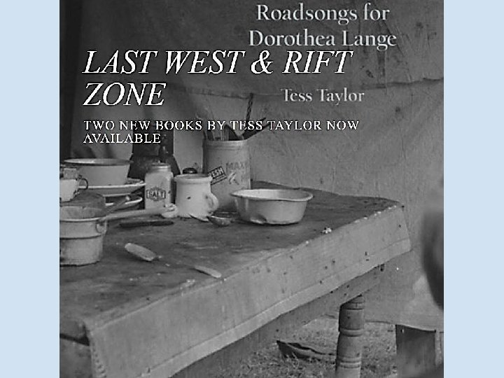 In 'Last West, ' poet Tess Taylor responds to Dorothea Lange This Dorothea Lange photograph, captioned "Mexican bathing facilities at Japanese ranch camp near Indio, March 3, 1935, " is reproduced from Last West: Roadsongs for Dorothea Lange, Tess Taylor's new collection of poetry written in response to Lange's work—on view now at Mo. MA. One poem ends: Like crooked highrises stacked grape crates gleam In low sun we keep driving: dusk falls & they dim— https: //www. tess-taylor. com/tess-newbooks