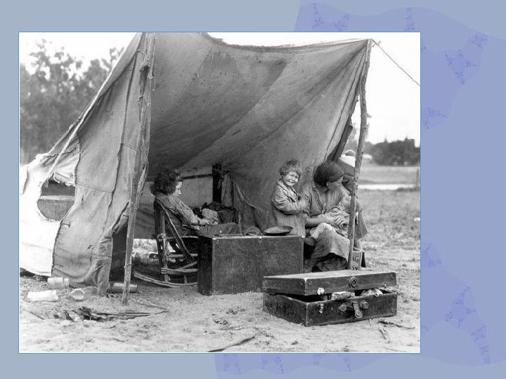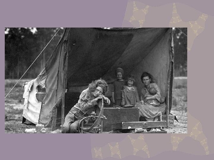 Lange took seven photos that day, the last being the famous Migrant Mother. These are the five other photos: Destitute pea pickers in California. Mother of seven children. Age thirty-two. en : Nipomo, California In the 1930 s, the FSA employed several photographers to document the effects of the Great Depression on Americans. Many of the photographs can also be seen as propaganda images to support the U. S. government's policy distributing support to the worst affected, poorer areas of the country. en : Dorothea Lange's image of a migrant pea picker, en: Florence Owens Thompson, and her family has become an icon of resilience in the face of adversity. Lange actually took six images that day, the last being the famous "Migrant Mother". This is a montage of the other five pictures. Persons in picture (left to right) are: Viola (Pete) in rocker, age 14, standing inside tent; Ruby, age 5; Katherine, age 4, seated on box; Florence, age 32, and infant Norma, age 1 year, being held by Florence. Pete has moved inside the tent, and away from Lange, in hopes her photo can not be taken. Katherine stands next to her mother. Florence is talking to Ruby, who is hiding behind her mother, as Lange took the picture. Florence is nursing Norma. Katherine has moved back from her mother as Lange approached to take this shot. Ruby is still hiding behind her mother. Left to right are Florence, Ruby and baby Norma. Florence stopped nursing Norma and Ruby has come out from behind her. This photograph was the one used by the newspapers the following day to report the story of the migrants. Portrait shows en : Florence Owens Thompson with several of her children in a photograph known as "Migrant Mother".