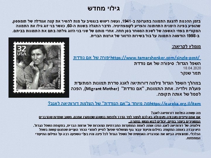Sources: https: //www. haaretz. co. il/gallery/art/. premium-MAGAZINE אם נודדת https: //www. tamarshenker. https: //www. exibartstreet. com/news/dorothea-lange https: //www. loc. gov/pictures/resource/fsa. 8 b 29516/ https: //he. wikipedia. 5: Florence_Owens_Thompson http: //100 photos. time. com/photos/dorothea-lange-migrant-mother https: //picryl. com/media/-pickers-camp-canyon-countyhttps: //www. widewalls. ch/dorothea-lange-photos-jeu-de-paume/ https: //www. exibartstreet. com/news/dorothea-lange/ https: //petapixel. com/2019/08/24/a-look-at-migrant-motherhttps: //www. khanacademy. org/humanities/art-1010/ Clarita-Efraim pps: www. clarita-efraim. com chefetze@netvision. net. il June 2020