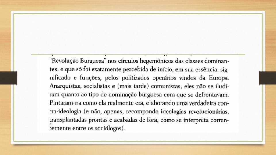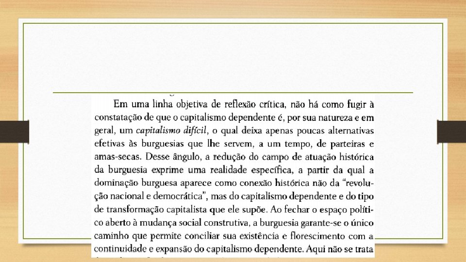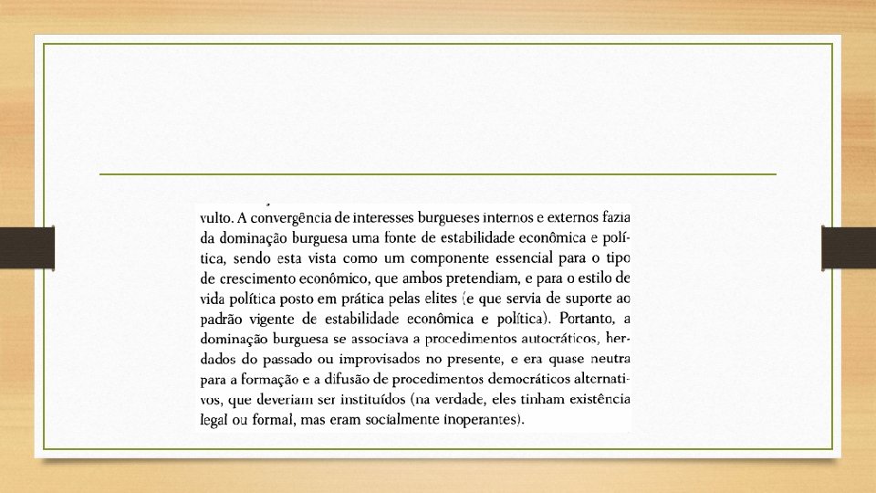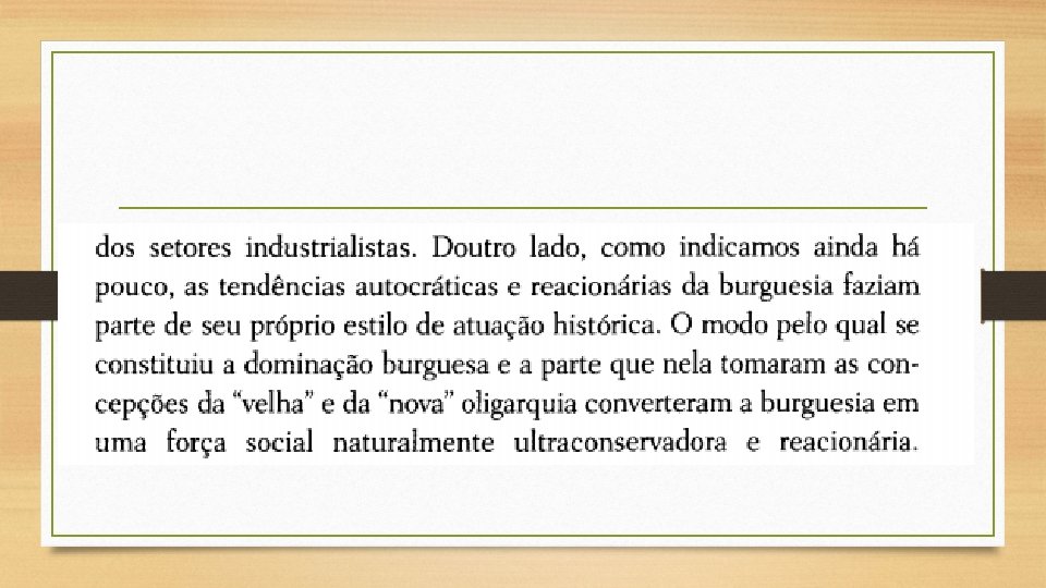 • Em suma, o regime compatível com a natureza peculiar da revolução burguesa no Brasil traz o timbre de uma classe dominante que, não obstante estar inscrita historicamente em um processo de transformação da sociedade, não suporta a polarização (e, portanto, também o conflito de classes) e, sob pressão, recua para a acomodação econômica e social e para o despotismo político.