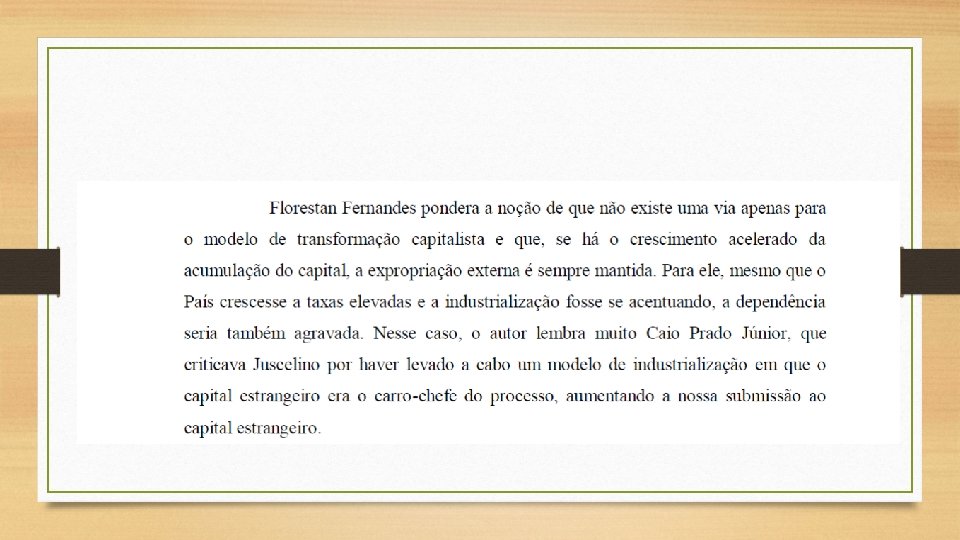 Debate sobre desenvolvimento e burguesia brasileira • Em relação a Caio Prado, Florestan Fernandes se distingue ao superar o “sonho da autonomia nacional” no interior do sistema capitalista. Para ele, no contexto da dependência, não há proposta nacionalista que possa amortecer a luta de classes e diminuir a exploração da burguesia dependente. • Florestan Fernandes explicita os limites reais, históricos, à emancipação e à autonomia nacionais: a dependência sempre renovada e revigorada. Por isso, ele pode ser considerado um dos criadores da teoria da nova dependência, ao lado de F. H. Cardoso.