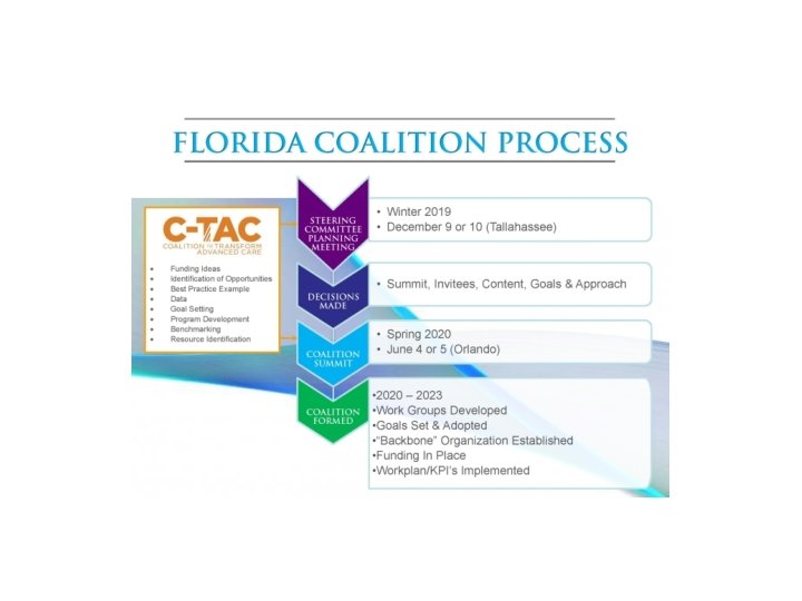 Why did we chose this approach? • Plans include using facilitator from Bridge Builders Strategies who works with C-TAC and supports the other palliative care coalitions in the US • Assessment of level of awareness and priority for other key stakeholders and participants • Planning for best approach for Florida to take