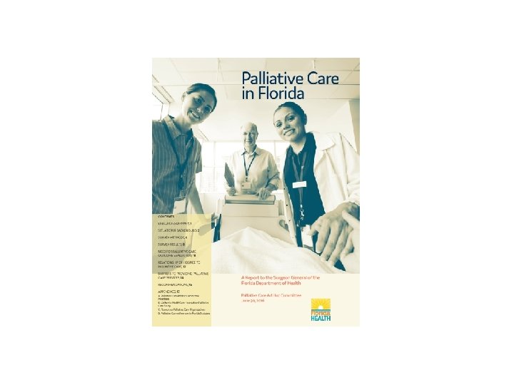 Florida’s Situation • Currently Florida’s statutes and regulations only mention and define palliative care as part of the hospice approach to care • There is no visibility of the number of programs, how care is being delivered and who is receiving it • No regulatory definitions or standards