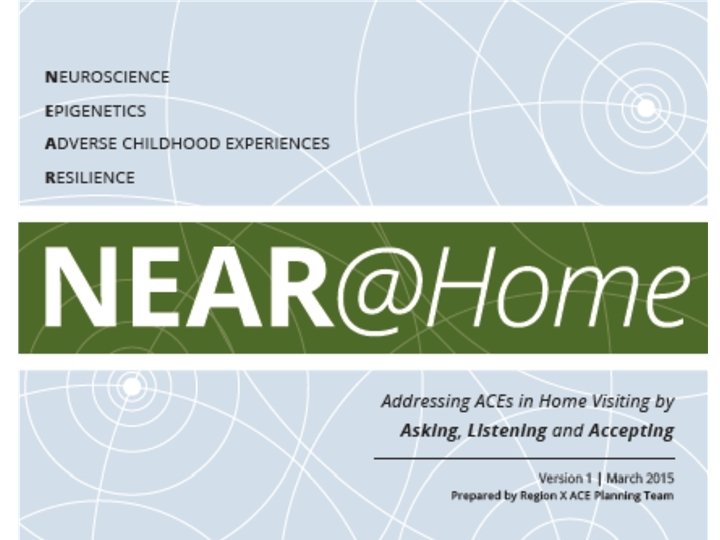 Ask, Listen, Affirm, Remember Home visitors use ACEs/NEAR framework with all parents to: • Educate about ACEs and associated health risks • Gather ACE histories (always voluntary) • Build resilience. Home Visitors are prepared to ask about ACE history Home Visitors respond with respect and curiosity: “How have these childhood experiences affected you? ” ”How have you done so well when you have had such a difficult childhood? ” “How would you like your child’s life to be different? ”