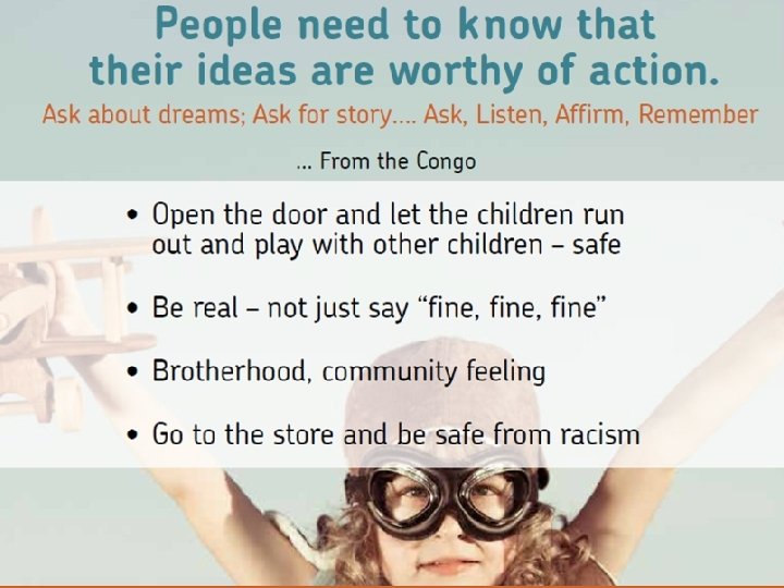 What Generates Belonging & Support? Developing ceremonies or rituals Including others in health-promoting activities Engaging in multiple family or whole community/workplace dialogues Creating art, movement, rhythm, music Effective accommodations Learning together Setting up mutual support/helping systems Foundation for Healthy Generations 2014