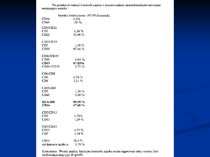 Antygeny dominujące w różnych typach białaczki: Ostra białaczka mieloblastyczna – AML CD 45, CD 13, CD 34, CD 15, HLA-DR, cyt MPO Ostra białaczka limfoblastyczna z linii B – ALL B CD 45, CD 19, CD 22, CD 20, HLA-DR, CD 34, cyt. łańcuch , Ig powierzchniowe cyt. CD 22 Ostra białaczka limfoblastyczna z linii T – ALL T CD 45, CD 2, CD 3, CD 4, CD 5, CD 8, CD 34, cyt. CD 3