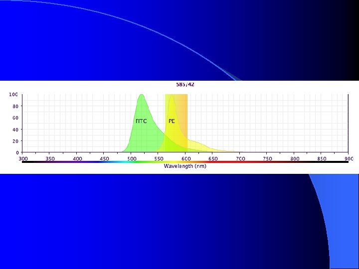 Compensation l Fluorochromes typically fluoresce over a large part of the spectrum (100 nm or more) l A detector may “see” fluorescence from more than 1 fluorochrome. (referred to as bleed over) l You need to “compensate” for this bleed over so that 1 detector reports signal from only 1 fluorochrome