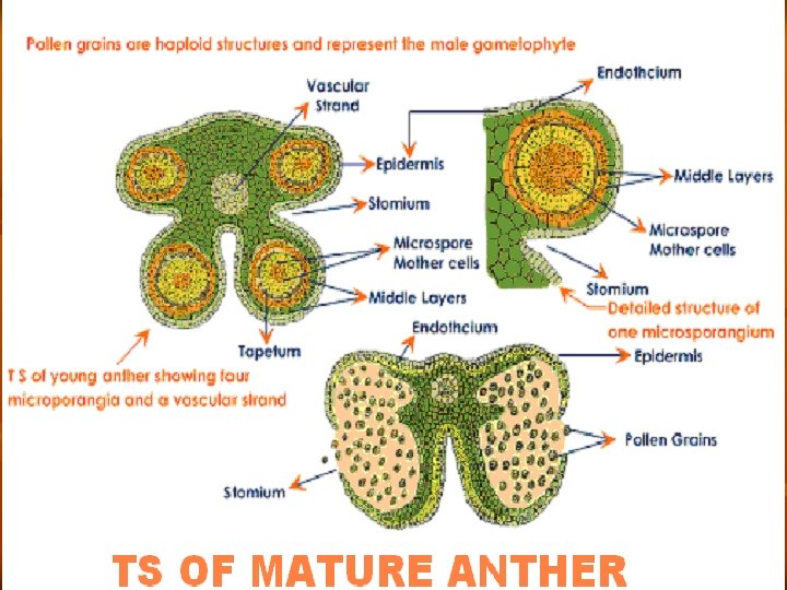 n n MICROSPORANGIAL WALL It is hypodermal wall having 3 -5 layers. Epidermis, endothecium, middle layers and the tapetum. The outer three layers performs the function of protection and help in dehiscence of other to release the pollen. The innermost wall layer is TAPETUM. It nourishes the developing pollen grains. Cells of the tapetum possess dense cytoplasm and generally have more than one nucleus.