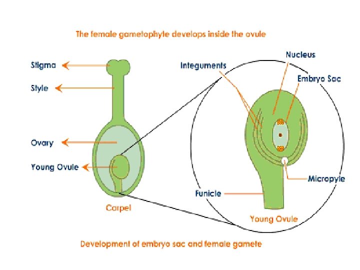 n n n Structural of Megasporangium (Ovule): the ovule is a small structure attached to the placenta by means of a stalk called funicle. The body of the ovule fuses with funicle in HILUM. Thus, hilum represents the junction between ovule and funicle. Each ovule has one or two protective envelopes called INTEGUMENTS. It encircle the ovule except at tip where a small opening called as MICROPYLE is organized. Opposite the micropylar end, is the CHALAZA, representing the basal part of the ovule. The main body of the ovule consist of parenchy matous tissue, the NUCELLUS. Located in the nucleus is the EMBRYOSAC or FEMAL GAMETOPHYTE.