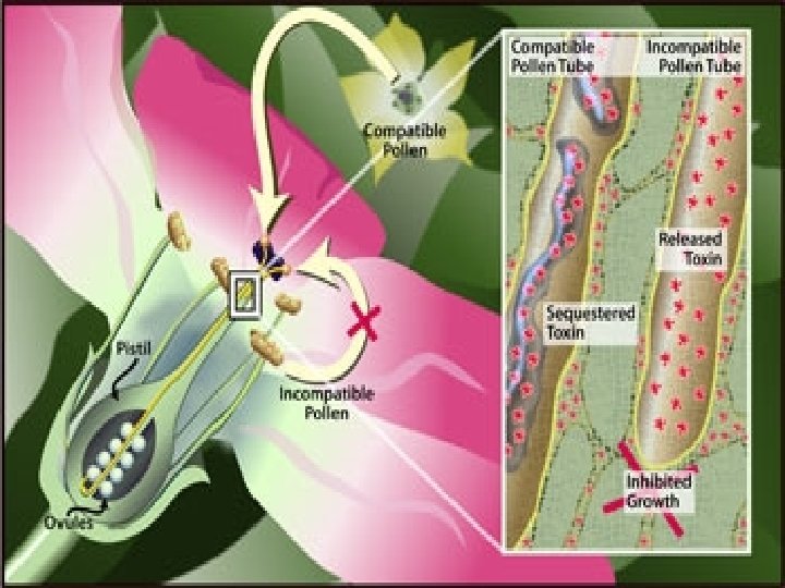 n n Pollen- Pistil Interaction: Pollen grains of a no. of plants descend over the stigma of a flower. All of them do not germinate there. Only the compatible pollen of the same species are able to germinate. Germination is connect with compatibility – incompatibility reaction between proteins presents over the pollen grains and the stigma. If the reaction is favourable, the pollen grains pick up water and nutrients from the stigma. It results in growth of pollen grains to from pollen tubes. Interaction between pollen tubes and pistil continue till the pollen tubes reach the ovule.