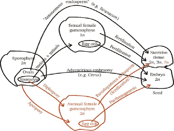 n n Seed Viability: It is the period of time for which the seed retain the ability to germinate. Environmental conditions which can alter the viability are humidity and temperature. Genetically seed viability ranges from a few days (eg. Oxalis), one season (eg. Birch), 2 -5 years (most crop plant) to 100 years (eg. Trifolium) Seed Viability has been found out to be more than 1000 years in lotus. 2000 years old seeds of phoenix dactylifera excavated from king herod’s place near dead sea have been found viable. Similarly 10, 000 years old seeds of Lupinus arcticus (Lupine) excavated from arctic Tundra not only germinated but also produced plants that flowered. Apomixis and Polyembryony