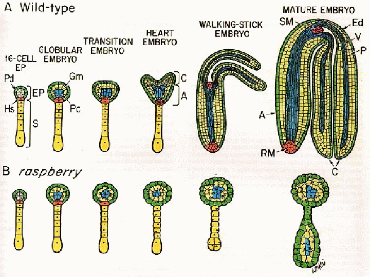 n n n Embryo: Embryo is the young future offspring which in seed plants develops inside mature fertilized ovule or seed. It is formed from zygote. Formation of embryo from zygote is called EMBRYOGENY. After fertilization, the zygote of the ovule divides transversely into two cells – a small terminal/ apical cell and a large basal cell. The first division of the zygote produces a hypobasal cell (BASAL) towards the micropyle and an epibasal (TERMINAL) towards the chalaza. The epibasal cell divides repeatedly tp produce a row of 4 -8 cells. The terminal cell divides in various planes to produce a cluster of cells, called the PROEMBRYO