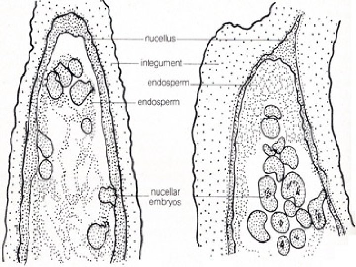 n n n POLYEMBYONY: - It is the phenomenon of formation of more than one embryo during the development of seed. Rao(1965) has found polyembryony to develop during seed germination in vandal caused by cleavage of apical promeristem of single embryo. Polyembryony was discovered by Leeuwenhoek(1719) in case of citrus. Polyembryony is of three types I] Simple- eg. Poa , Casuarinas, Citrus II] Cleavage polyembryony- eg. Pinus, orchids III] Adventitive polyembryony-eg. Citrus, opuntia , Onion, Mangifera, Trillium, Groundnut.