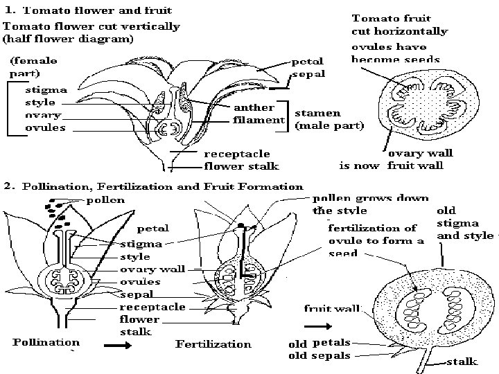 n n n As ovules mature in seeds, the ovary develops into fruit i. e. the transformation of the ovule into seeds and ovary into fruits proceeds simultaneously. The wall of the ovary develops into wall of fruit called PERICARB. The fruit may be fleshy as in Guava. Orange, Mango etc or may be dry as in groundnut and mustard etc. In most plants, by the time the fruit develops from the ovary, other floral parts degenerate and fall off. But, in few species such Apple, Strawberry, Cashew, etc. The thalamus also contribute to fruit formation. Such fruits are called FALSE FRUITS. Most fruits develop only from ovary and are called true fruit eg. Tomato, Grapes etc. PARTHENOCARPIC FRUITS: This fruits develops without fertilization and do not bear seeds.