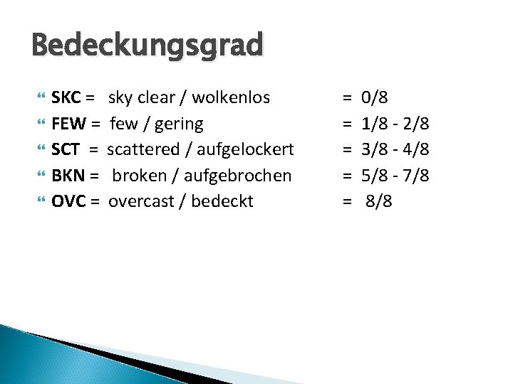 Bedeckungsgrad SKC = FEW = SCT = BKN = OVC = sky clear / wolkenlos few / gering scattered / aufgelockert broken / aufgebrochen overcast / bedeckt = = = 0/8 1/8 - 2/8 3/8 - 4/8 5/8 - 7/8 8/8
