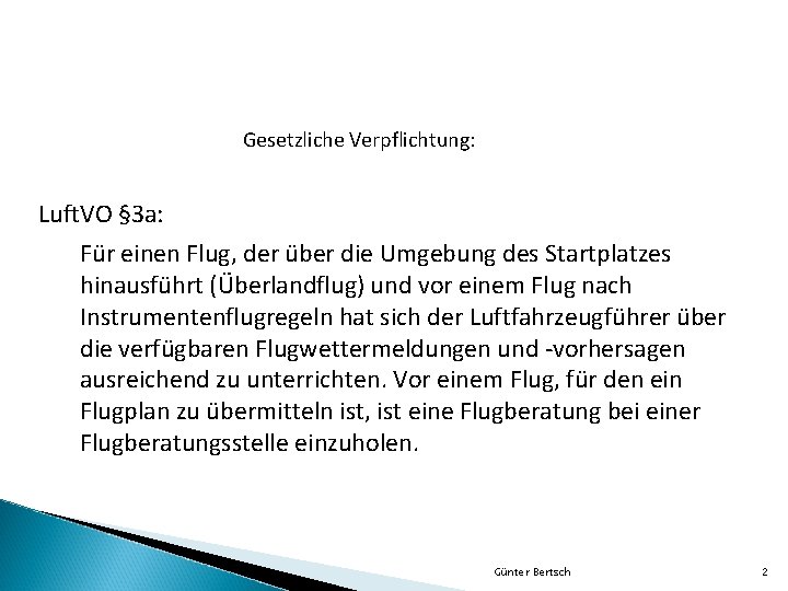 Gesetzliche Verpflichtung: Luft. VO § 3 a: Für einen Flug, der über die Umgebung des Startplatzes hinausführt (Überlandflug) und vor einem Flug nach Instrumentenflugregeln hat sich der Luftfahrzeugführer über die verfügbaren Flugwettermeldungen und -vorhersagen ausreichend zu unterrichten. Vor einem Flug, für den ein Flugplan zu übermitteln ist, ist eine Flugberatung bei einer Flugberatungsstelle einzuholen. Günter Bertsch 2