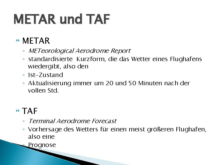 METAR und TAF METAR ◦ METeorological Aerodrome Report ◦ standardisierte Kurzform, die das Wetter eines Flughafens wiedergibt, also den ◦ Ist-Zustand ◦ Aktualisierung immer um 20 und 50 Minuten nach der vollen Std. TAF ◦ Terminal Aerodrome Forecast ◦ Vorhersage des Wetters für einen meist größeren Flughafen, also eine ◦ Prognose