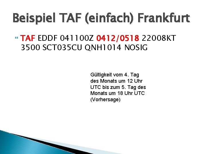 Beispiel TAF (einfach) Frankfurt TAF EDDF 041100 Z 0412/0518 22008 KT 3500 SCT 035 CU QNH 1014 NOSIG Gültigkeit vom 4. Tag des Monats um 12 Uhr UTC bis zum 5. Tag des Monats um 18 Uhr UTC (Vorhersage)
