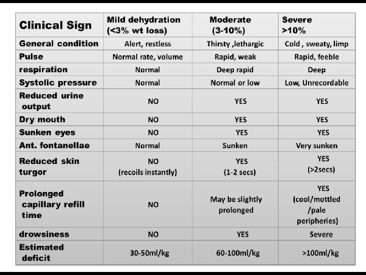 Classify Dehydration as to Severity n n n Mild: Earliest signs of dehydration – 30 -50 ml/kg deficit (3 -5% dehydration) Moderate: Signs of dehydration more pronounced – 60 -100 ml/kg deficit (6 -10%) Severe: Impending or actual circulatory failure – 90 -150 ml/kg deficit (9 -15%) Smaller children (e. g. , < 2 years old) use 5%-10%-15% dehydration In larger children (e. g. , > 2 years old) use 3%-6%-9% rather than 5%-10%-15% to avoid providing excessive volumes of fluid Alternative approach: IV rate of one and a half maintenance for mild to moderate dehydration and twice maintenance for moderate to severe dehydration