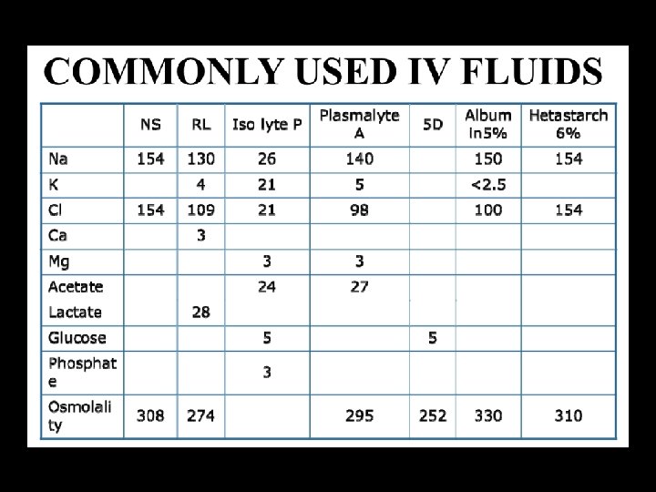 Ongoing Abnormal Losses n n n Maintenance solution is designed to replace ongoing normal losses Ongoing abnormal losses: Diarrhea, ostomy drainage, chest tube drainage, ventricular fluid drainage Possible to measure electrolytes in the fluid but is usually unnecessary – May be useful if there is a large volume of drainage accompanied by significant electrolyte imbalance Nasogasric drainage: 0. 45% (or 0. 9%) Na. Cl with 20 -40 meq/l KCl Ileostomy drainage: 0. 9% Na. Cl with 10 -20 meq/l KCl or KAcetate