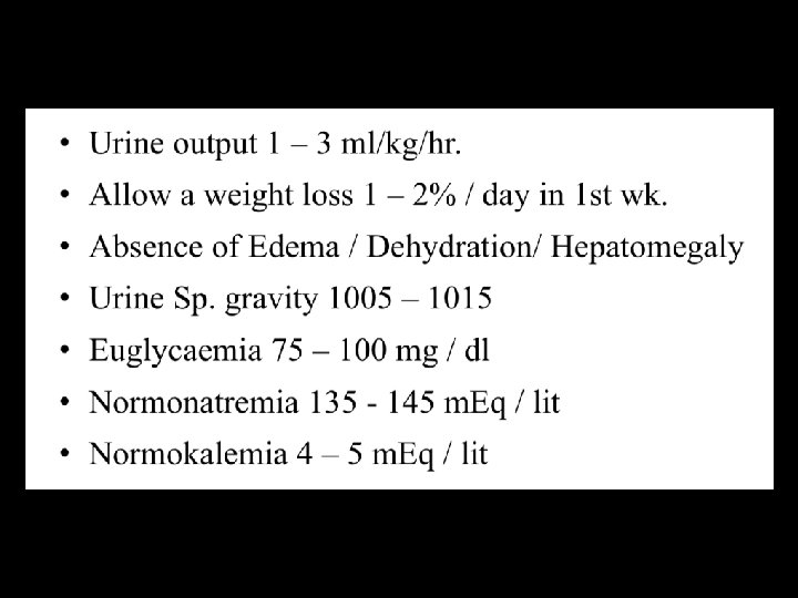 Water and Electrolyte Requirements Based on Weight n n Water: – 0 -10 kg: 100 ml/kg – 10 -20 kg: 1000 ml plus 50 ml/kg – > 20 kg: 1500 ml plus 20 ml/kg Electrolytes: – Na: 2 -3 meq/kg – K: 1 -2 meq/kg Water requirement is the same as with the caloric-based system Electrolyte requirement is greater than with caloric-based system: Electrolyte requirement is a direct linear function of weight