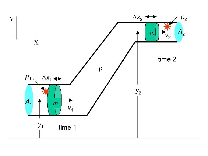 K = ½ m v 22 - ½ m v 12 = ½ V v 22 - ½ V v 12 U = m g y 2 – m g y 1 = V g y 2 = V g y 1 Wnet = F 1 x 1 – F 2 x 2 = p 1 A 1 x 1 – p 2 A 2 x 2 Wnet = p 1 V – p 2 V = K + U p 1 V – p 2 V = ½ V v 22 - ½ V v 12 + V g y 2 - V g y 1 Rearranging p 1 + ½ v 12 + g y 1 = p 2 + ½ v 22 + g y 2 Applies only to an ideal fluid (zero viscosity)