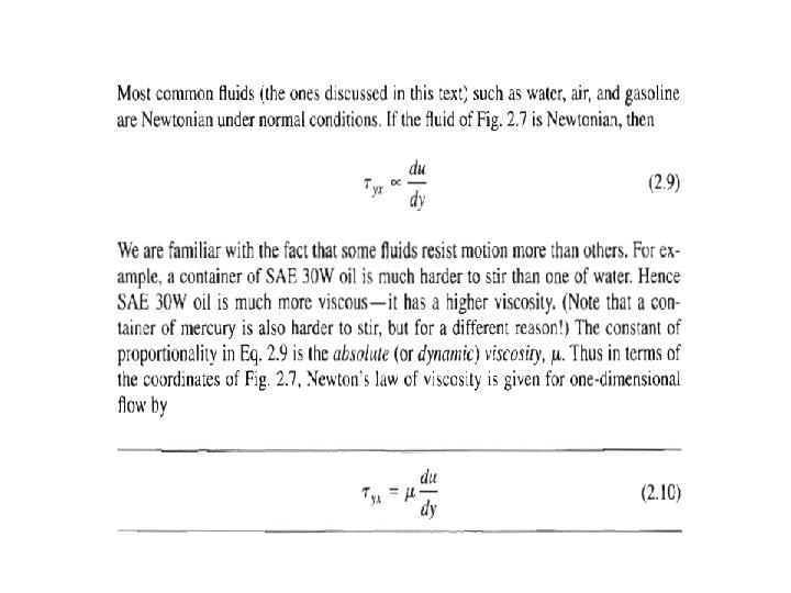 Viscosity • Viscosity is a measure of the resistance of a fluid which is being deformed by either shear stress or tensile stress. In everyday terms (and for fluids only), viscosity is "thickness" or "internal friction". Thus, water is "thin", having a lower viscosity, while honey is "thick", having a higher viscosity. Put simply, the less viscous the fluid is, the greater its ease of movement (fluidity). [1] • The degree to which a fluid resist flow under an applied force called coefficient of viscosity or dynamic viscosity. (mue). Kinematic viscosity is the dynamics viscosity divided by density of the fluid (pa-s {N·s/m 2}, poise(cgi)).