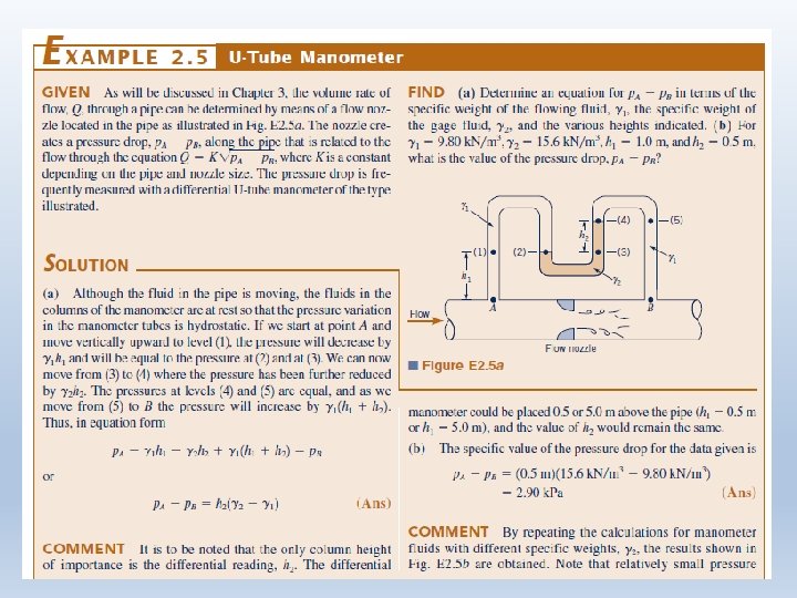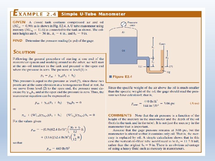 Measurement of Pressure Absolute Pressure: Pressure measured relative to a perfect vacuum Gage Pressure: Pressure measured relative to local atmospheric pressure • A gage pressure of zero corresponds to a pressure that is at local atmospheric pressure. • Absolute pressure is always positive • Gage pressure can be either negative or positive • Negative gage pressure is known as a vacuum or suction • Standard units of Pressure are psi, psia, k. Pa (absolute) • Pressure could also be measured in terms of the height of a fluid in a column • Units in terms of fluid column height are mm Hg, inches of H 20, etc Example: Local Atmospheric Pressure is 14. 7 psi, and I measure a 20 psia (“a” is for absolute). What is the gage pressure? The gage pressure is 20 psia – 14. 7 psi = 5. 3 psi If I measure 10 psia, then the gage pressure is -4. 7 psi, or is a “vacuum”.