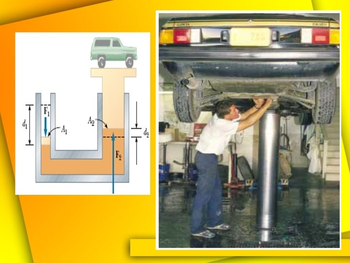 • Perhatikan sistem fluida di samping: – Gaya ke bawah F 1 bekerja pada piston dengan luas A 1. – Gaya diteruskan melalui fluida sehingga menghasilkan gaya ke atas F 2. – Prinsip Pascal: perubahan tekanan akibat F 1 yaitu F 1/A 1 diteruskan pada fluida. F 1 F = 2 A 1 A 2 F 2 = F 1 A 2 A 1 • F 2 > F 1 : pelanggaran hukum kekekalan energi? ?