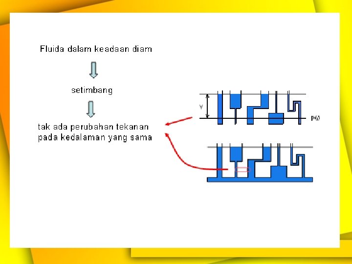 Contoh : Jika massa jenis suatu minyak yang berada pada bagian atas adalah 800 kg/m 3 dan masa jenis air rair adalah 1000 kg/m 3 , tentukan besarnya tekanan yang di alami suatu titik berjarak y = 0, 25 meter dari dasar. Ambil h = 1 meter , h 1 = h 2 = 0, 5 meter dan A = p /100 m 2 serta g = 10 m/s 2. Jawab: Telah diketahui bahwa luas penampang tidak menyumbangkan pengaruh apapun dalam menentukan tekanan fluida, yang berpengaruh hanyalah ketinggian fluida di atasnya. Semisal py menyatakan tekanan fluida di titik y h 1 h h 2 A