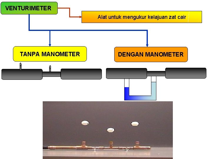 VENTURIMETER Alat untuk mengukur kelajuan zat cair TANPA MANOMETER DENGAN MANOMETER