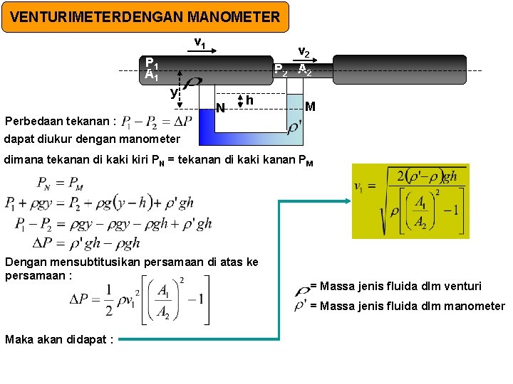 VENTURIMETERDENGAN MANOMETER v 1 P 1 A 1 P 2 y Perbedaan tekanan : N h v 2 A 2 M dapat diukur dengan manometer dimana tekanan di kaki kiri PN = tekanan di kaki kanan PM Dengan mensubtitusikan persamaan di atas ke persamaan : = Massa jenis fluida dlm venturi = Massa jenis fluida dlm manometer Maka akan didapat :
