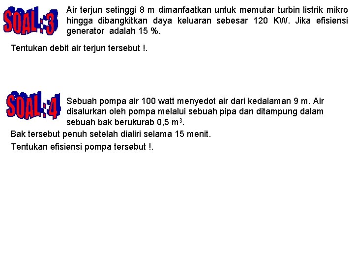 Air terjun setinggi 8 m dimanfaatkan untuk memutar turbin listrik mikro hingga dibangkitkan daya keluaran sebesar 120 KW. Jika efisiensi generator adalah 15 %. Tentukan debit air terjun tersebut !. Sebuah pompa air 100 watt menyedot air dari kedalaman 9 m. Air disalurkan oleh pompa melalui sebuah pipa dan ditampung dalam sebuah bak berukurab 0, 5 m 3. Bak tersebut penuh setelah dialiri selama 15 menit. Tentukan efisiensi pompa tersebut !.