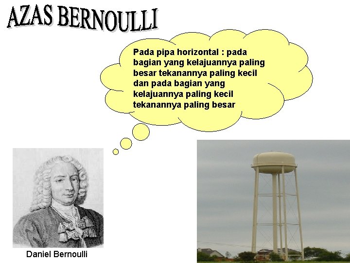 Pada pipa horizontal : pada bagian yang kelajuannya paling besar tekanannya paling kecil dan pada bagian yang kelajuannya paling kecil tekanannya paling besar Daniel Bernoulli