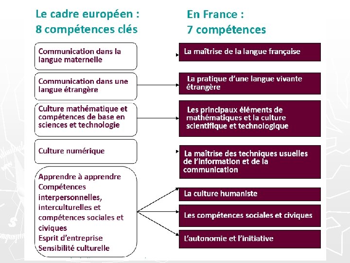 Un cadre juridique ► Un cadre européen : Le socle commun de connaissances et de compétences s’inscrit dans la logique des résolutions européennes sur l’orientation et la formation tout au long de la vie. ► Une obligation juridique : - En France, le socle commun de connaissances et de compétences a été instauré par la loi d’orientation pour l’avenir de l’école de 2005. - Défini par le décret du 11 juillet 2006, il est constitué de 7 compétences. - Le livret personnel de compétences permet de formaliser la maîtrise de ces compétences.