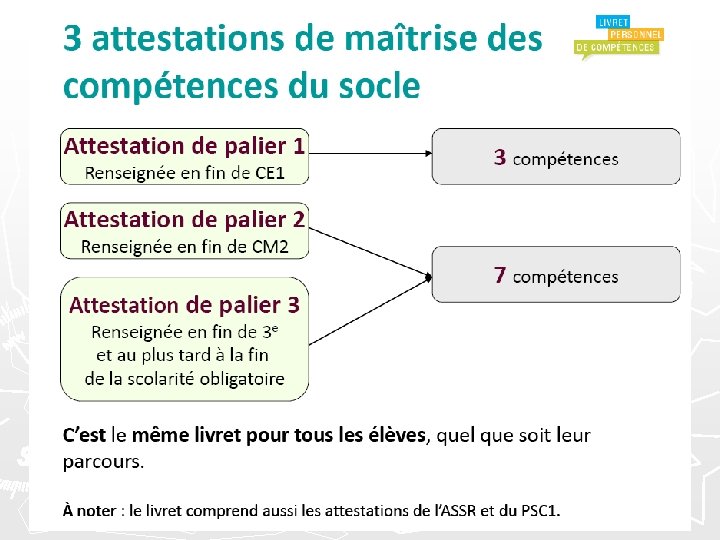 Une personnalisation des parcours ► L’état détaillé des acquis de l’élève, présenté dans le livret, permet aux équipes pédagogiques : ► d’identifier les points forts et les difficultés de chaque élève, ► de mieux définir les aides à mettre en place : § § pour un PPRE lors d'un changement d'établissement scolaire lors des changements de cycle lorsque l’élève entre dans des dispositifs particuliers: alternance, classes et ateliers relais,