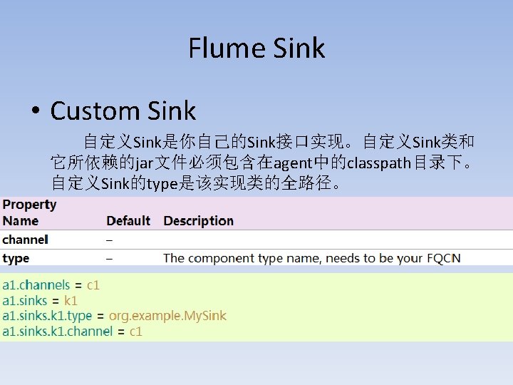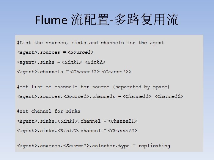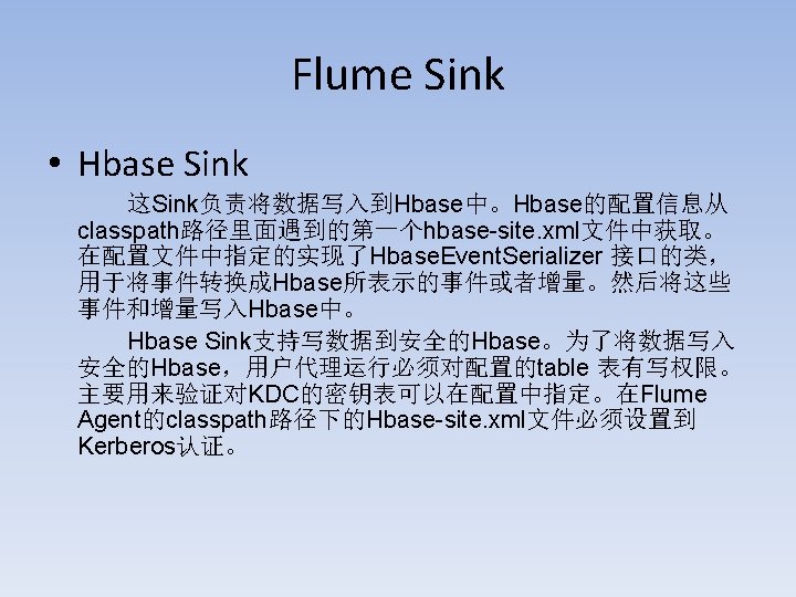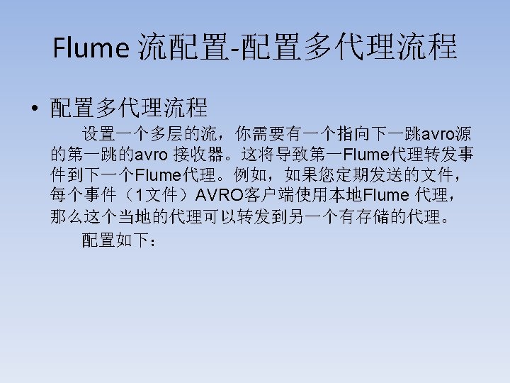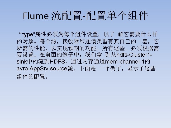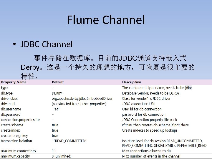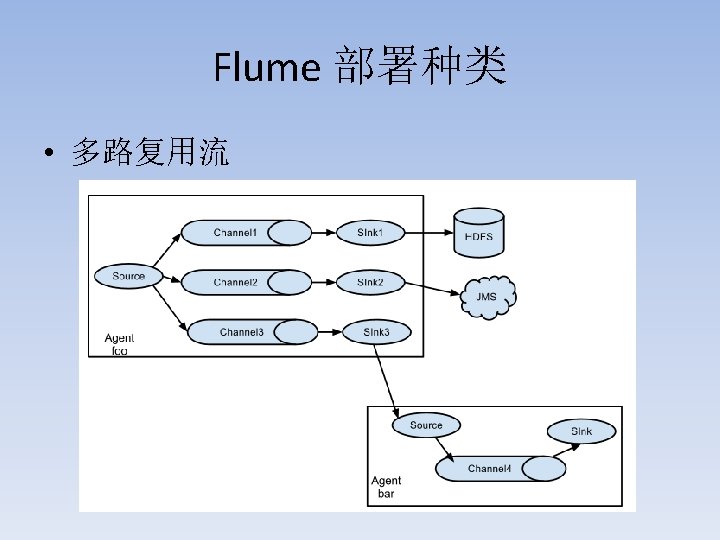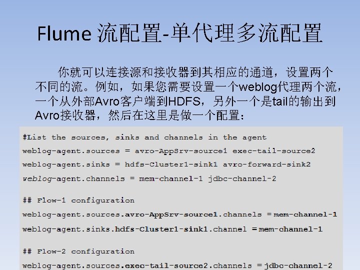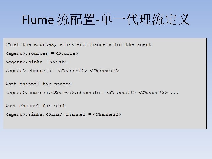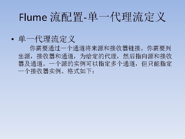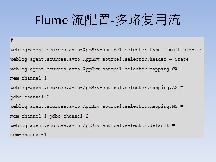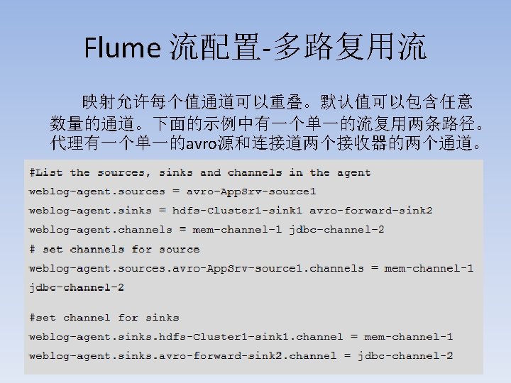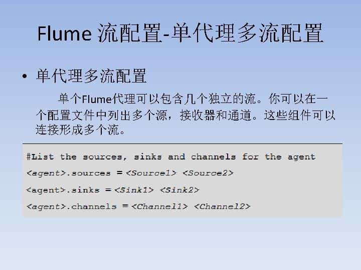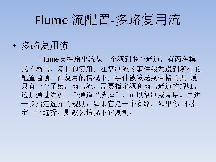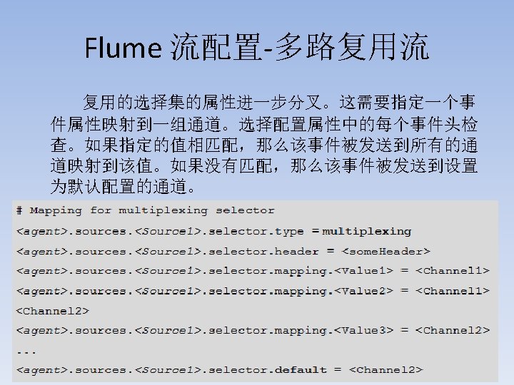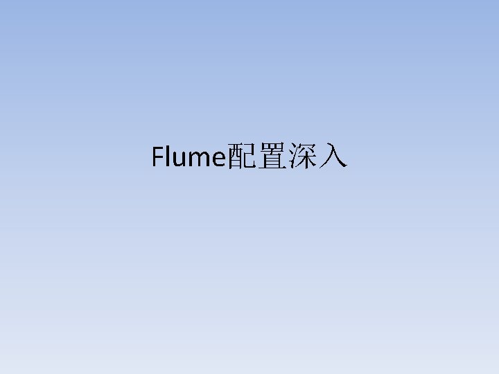 Flume Flume Flume Flume Source Flume Sink Flume Slides: 88 Download presentation Flume配置深入 • • Flume部署种类 Flume流配置 Flume Source Flume Sink Flume Channel Flume Interceptor Flume拓扑分析 Flume 流配置-配置多代理流程 这里我们连接从weblog-agent的avro-forward-sink 到 hdfs-agent的avro-collection-source收集源。最终结果从 外部源的appserver最终存储在HDFS的事件。 Flume Source • Avro Source Flume Source • Thrift Source Flume Source • Exec Source Flume Source • JMS Source Flume Source • JMS Source Flume Source • Net. Cat Source Flume Source • Spooling Directory Source Flume Source • Syslog Sources 读取syslog数据,并生成Flume event。 UDP Source将整个消息作为一个单一的event。 TCP Source 为每一个用回车( n)来分隔的字符串创建一个新的事件。 Ø Syslog TCP Source Ø Multiport Syslog TCP Source Ø Syslog UDP Source Flume Source Ø Syslog TCP Source Flume Source Ø Multiport Syslog TCP Source Flume Source Ø Multiport Syslog TCP Source Flume Source Ø Syslog UDP Source Flume Source • HTTP Source 一个Source接受flume event通过HTTP POST和 GET。 GET应只用于实验。Flume event 使用一个可插 拔的“handler”程序来实现转换,它必须实现的 HTTPSource. Handler接口。此处理程序需要一个 Http. Servlet. Request和返回一个flume event列表。 Flume Source • HTTP Source Flume Source • Custom Source 一个Custom Source其实是对Source接口的实现。当 我们开始flume agent的时候必须将Custom Source和相依 赖的jar放到agent的classpath下面。Custom Source的 type就是我们实现Source接口对应的类全路径。 Flume Sink • HDFS Sink Flume Sink • HDFS Sink Flume Sink • IRC Sink 从通道中取得信息到IRC Server。 Flume Sink • Hbase Sink Flume Sink • Hbase Sink Flume Sink • Async. Hbase Sink Flume Channel • 通道是一个仓库,事件存储在上面。源通过通道添加事件, 接收器通过通道取事件。 Ø Memory Channel Ø JDBC Channel Ø File Channel Ø Pseudo Transaction Channel Ø Custom Channel Flume Channel • Memory Channel Flume Channel • File Channel Flume Channel • Pseudo Transaction Channel 备注: 仅仅用来测试目的,不是在生产环境中使用。 Flume Channel • Custom Channel是对channel接口的实现。需要在 classpath中引入实现类和相关的jar文件。这Channel对应的 type是该类的完整路径。 Flume Channel Selectors • Replicating Channel Selector (default) Flume Channel Selectors • Multiplexing Channel Selector Flume Channel Selectors • Custom Channel Selector 实现Channel. Selector 接口。 Flume Sink Processors • Default Sink Processor 接收单一的Sink,不强制用户 为Sink创建Processor。 Flume Sink Processors • Failover Sink Processor Flume Sink Processors • Load balancing Sink Processor Flume Event Serializers • file_roll sink 和hdfs sink 都支持Event. Serializer 接口。 Ø Body Text Serializer Ø Avro Event Serializer Flume Event Serializers • Avro Text Serializer 别名:avro_event。这个拦截器将把事件序列化到一 个Avro容器文件中。使用的模式和RPC Avro机制使用到 的处理flume事件的机制一样。 这个序列化器继承自 Abstract. Avro. Event. Serializer类。 Flume Interceptors • Timestamp Interceptor 该拦截器可以往event的header中插入关键词为 timestamp的时间戳。 Flume Interceptors • Static Interceptor 该拦截器允许用户增加一个static 的header并为所有 的事件赋值。