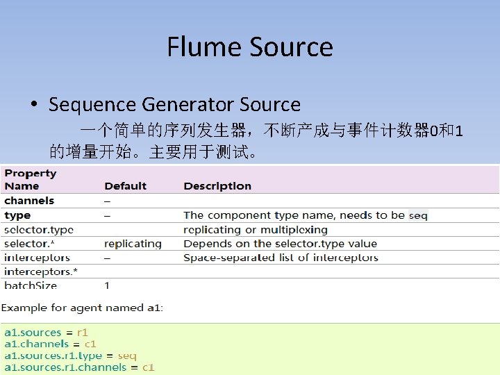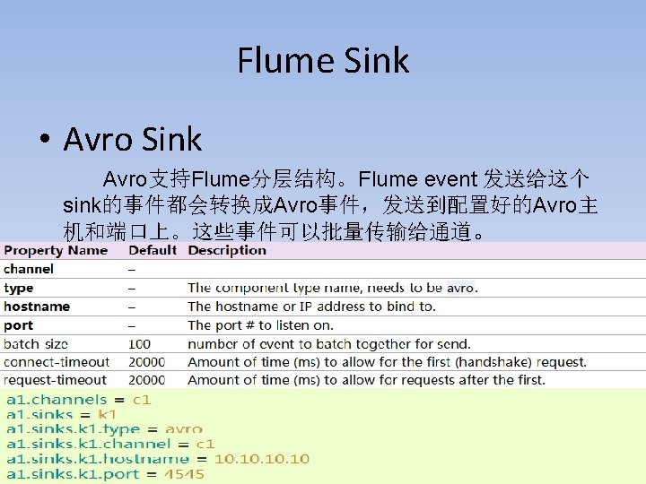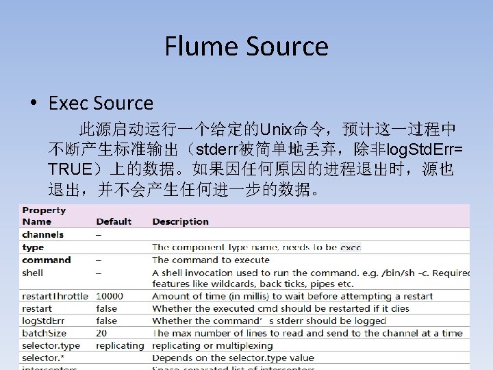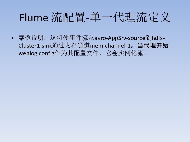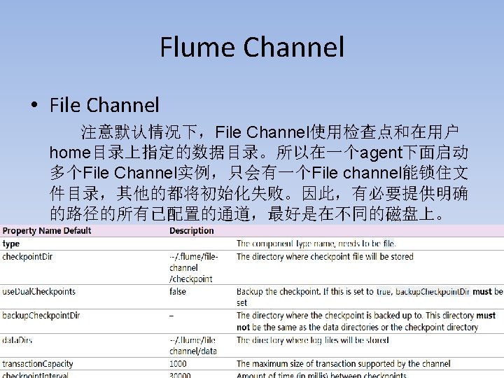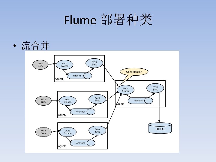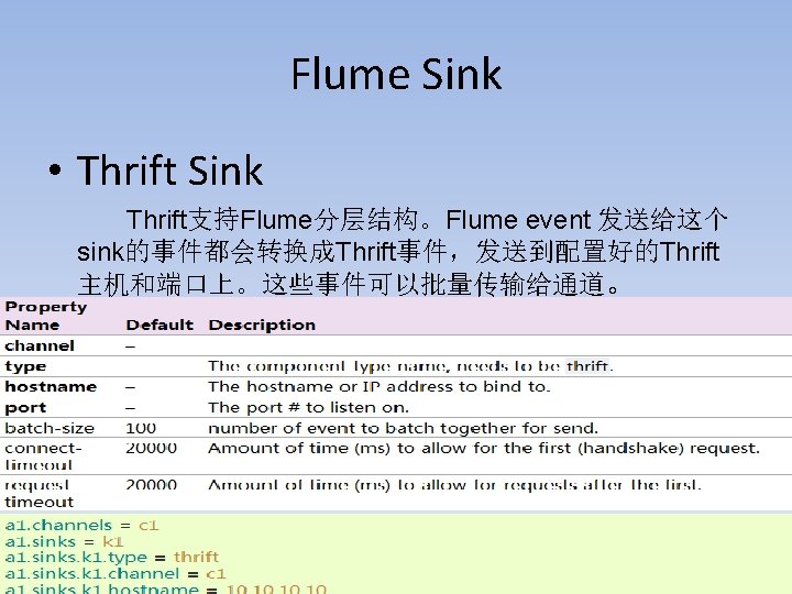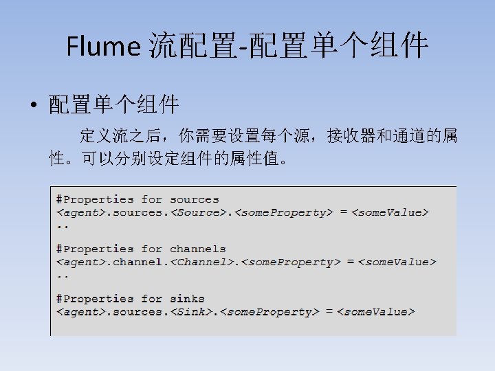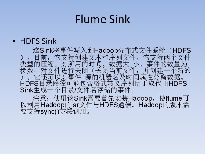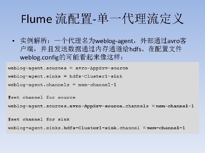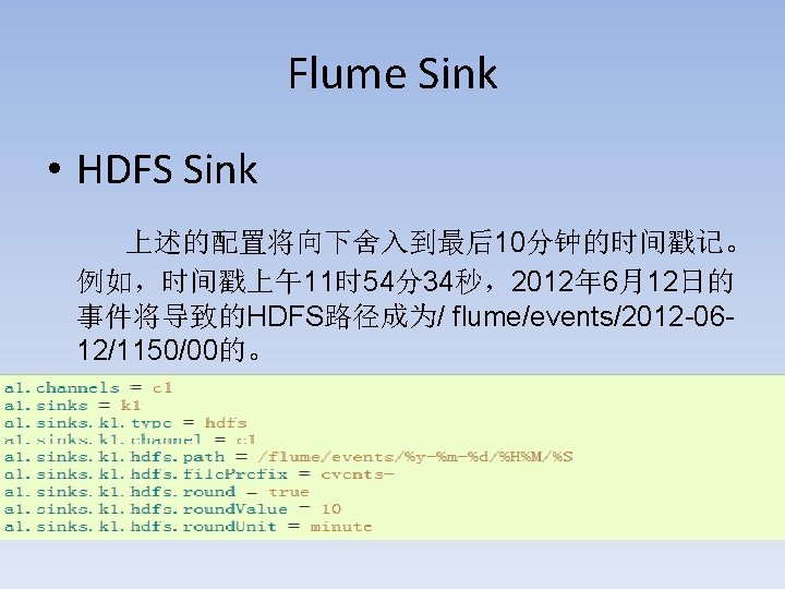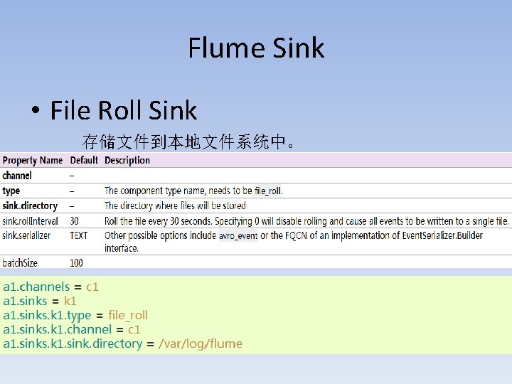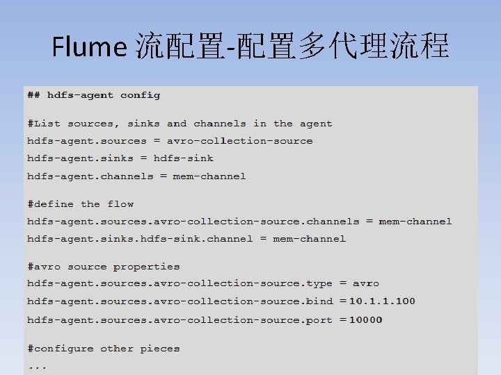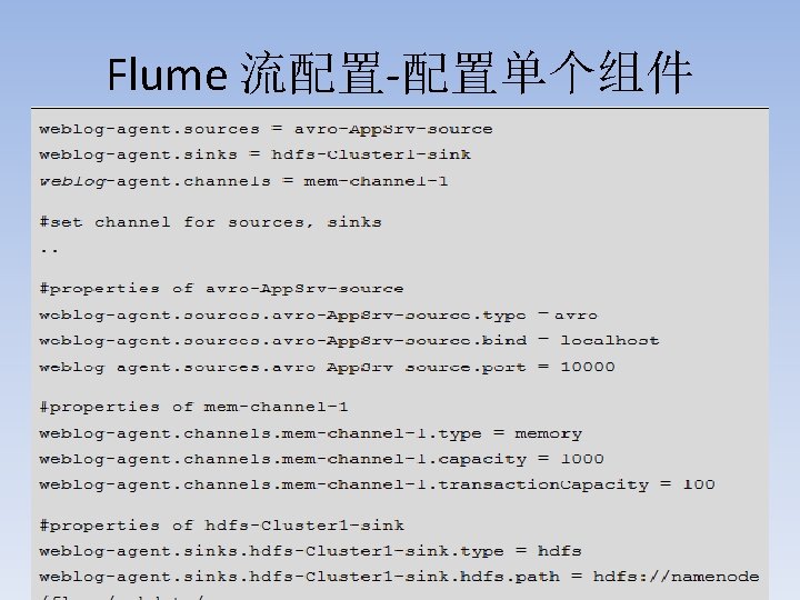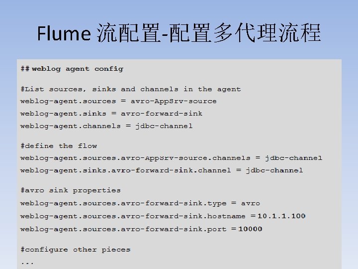 Flume Flume Flume Flume Source Flume Sink Flume Slides: 88 Download presentation Flume配置深入 • • Flume部署种类 Flume流配置 Flume Source Flume Sink Flume Channel Flume Interceptor Flume拓扑分析 Flume 流配置-配置多代理流程 这里我们连接从weblog-agent的avro-forward-sink 到 hdfs-agent的avro-collection-source收集源。最终结果从 外部源的appserver最终存储在HDFS的事件。 Flume Source • Avro Source Flume Source • Thrift Source Flume Source • Exec Source Flume Source • JMS Source Flume Source • JMS Source Flume Source • Net. Cat Source Flume Source • Spooling Directory Source Flume Source • Syslog Sources 读取syslog数据,并生成Flume event。 UDP Source将整个消息作为一个单一的event。 TCP Source 为每一个用回车( n)来分隔的字符串创建一个新的事件。 Ø Syslog TCP Source Ø Multiport Syslog TCP Source Ø Syslog UDP Source Flume Source Ø Syslog TCP Source Flume Source Ø Multiport Syslog TCP Source Flume Source Ø Multiport Syslog TCP Source Flume Source Ø Syslog UDP Source Flume Source • HTTP Source 一个Source接受flume event通过HTTP POST和 GET。 GET应只用于实验。Flume event 使用一个可插 拔的“handler”程序来实现转换,它必须实现的 HTTPSource. Handler接口。此处理程序需要一个 Http. Servlet. Request和返回一个flume event列表。 Flume Source • HTTP Source Flume Source • Custom Source 一个Custom Source其实是对Source接口的实现。当 我们开始flume agent的时候必须将Custom Source和相依 赖的jar放到agent的classpath下面。Custom Source的 type就是我们实现Source接口对应的类全路径。 Flume Sink • HDFS Sink Flume Sink • HDFS Sink Flume Sink • IRC Sink 从通道中取得信息到IRC Server。 Flume Sink • Hbase Sink Flume Sink • Hbase Sink Flume Sink • Async. Hbase Sink Flume Channel • 通道是一个仓库,事件存储在上面。源通过通道添加事件, 接收器通过通道取事件。 Ø Memory Channel Ø JDBC Channel Ø File Channel Ø Pseudo Transaction Channel Ø Custom Channel Flume Channel • Memory Channel Flume Channel • File Channel Flume Channel • Pseudo Transaction Channel 备注: 仅仅用来测试目的,不是在生产环境中使用。 Flume Channel • Custom Channel是对channel接口的实现。需要在 classpath中引入实现类和相关的jar文件。这Channel对应的 type是该类的完整路径。 Flume Channel Selectors • Replicating Channel Selector (default) Flume Channel Selectors • Multiplexing Channel Selector Flume Channel Selectors • Custom Channel Selector 实现Channel. Selector 接口。 Flume Sink Processors • Default Sink Processor 接收单一的Sink,不强制用户 为Sink创建Processor。 Flume Sink Processors • Failover Sink Processor Flume Sink Processors • Load balancing Sink Processor Flume Event Serializers • file_roll sink 和hdfs sink 都支持Event. Serializer 接口。 Ø Body Text Serializer Ø Avro Event Serializer Flume Event Serializers • Avro Text Serializer 别名:avro_event。这个拦截器将把事件序列化到一 个Avro容器文件中。使用的模式和RPC Avro机制使用到 的处理flume事件的机制一样。 这个序列化器继承自 Abstract. Avro. Event. Serializer类。 Flume Interceptors • Timestamp Interceptor 该拦截器可以往event的header中插入关键词为 timestamp的时间戳。 Flume Interceptors • Static Interceptor 该拦截器允许用户增加一个static 的header并为所有 的事件赋值。