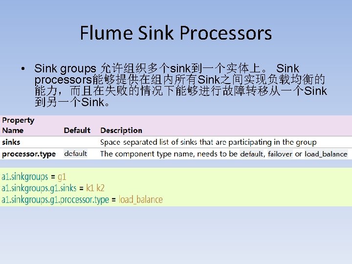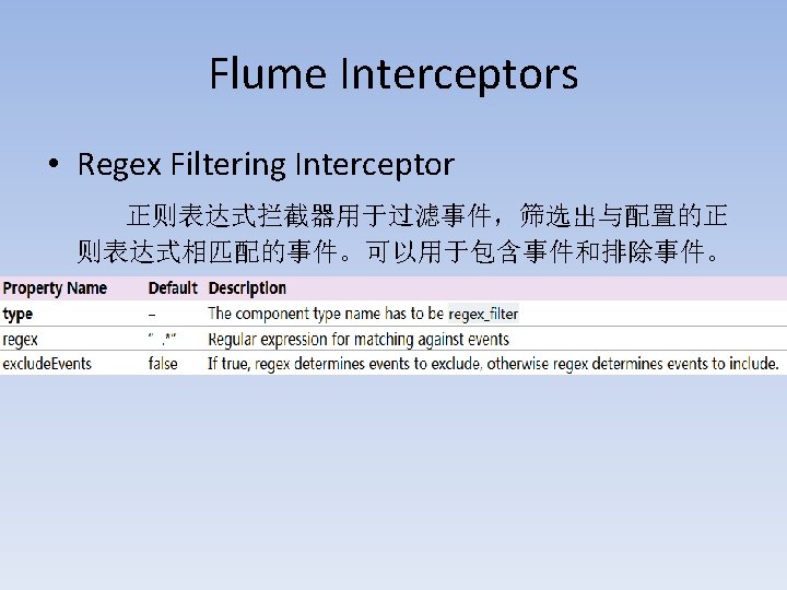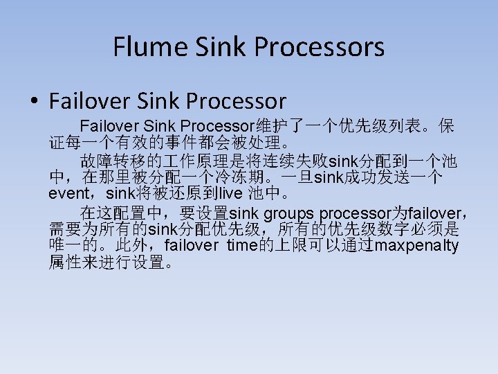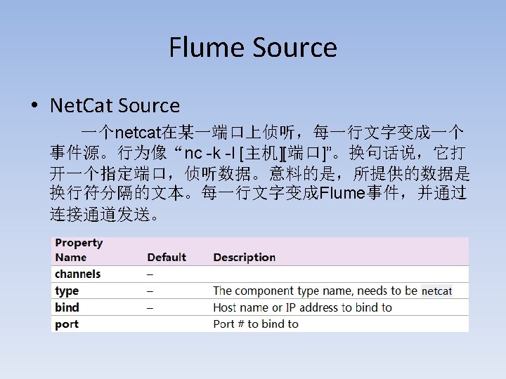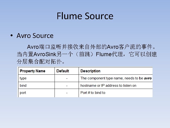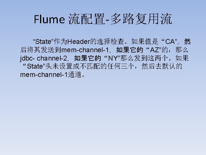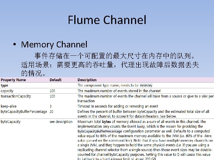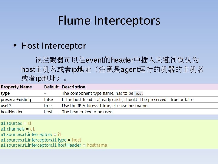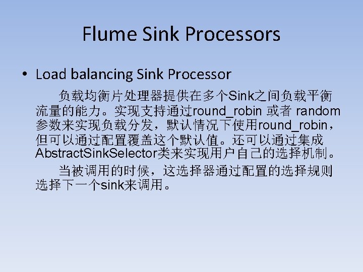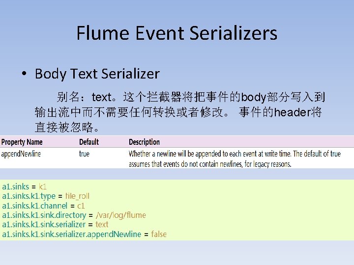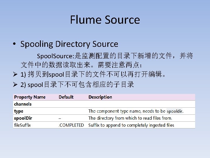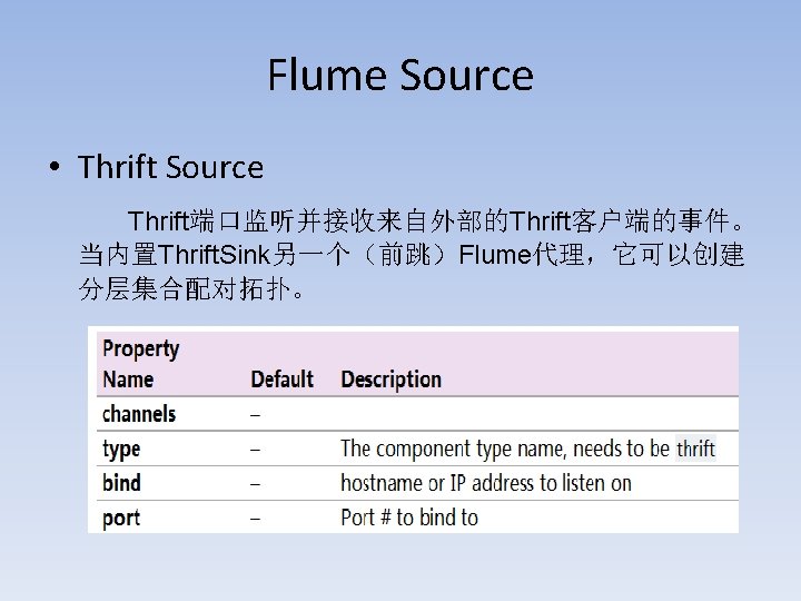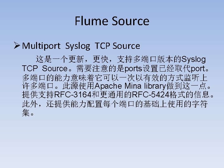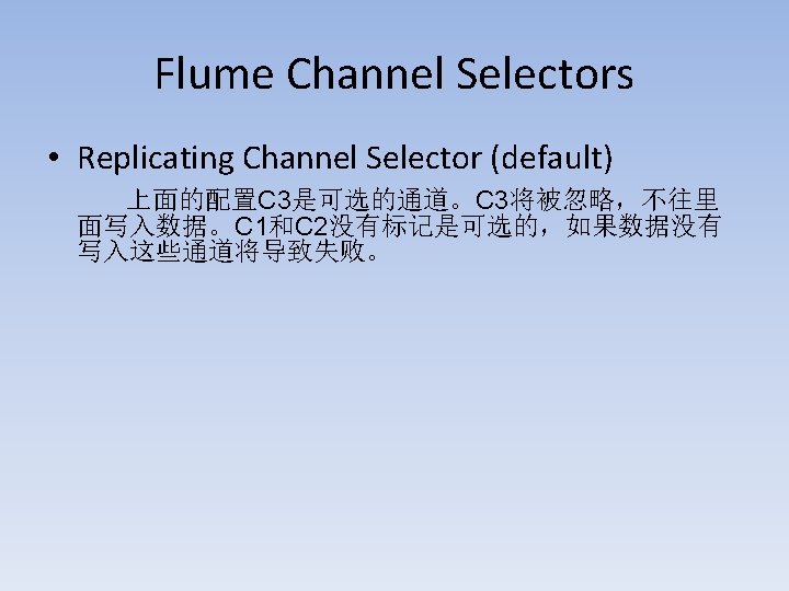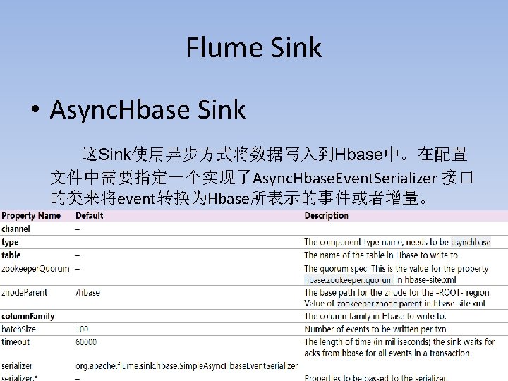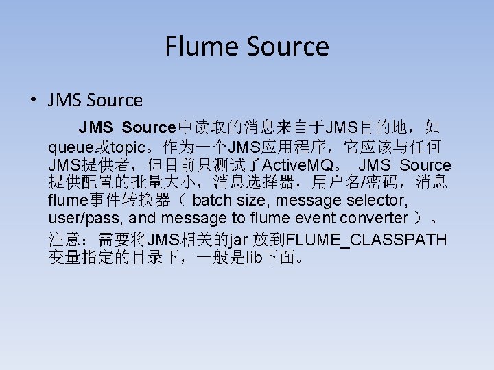 Flume Flume Flume Flume Source Flume Sink Flume Slides: 88 Download presentation Flume配置深入 • • Flume部署种类 Flume流配置 Flume Source Flume Sink Flume Channel Flume Interceptor Flume拓扑分析 Flume 流配置-配置多代理流程 这里我们连接从weblog-agent的avro-forward-sink 到 hdfs-agent的avro-collection-source收集源。最终结果从 外部源的appserver最终存储在HDFS的事件。 Flume Source • Avro Source Flume Source • Thrift Source Flume Source • Exec Source Flume Source • JMS Source Flume Source • JMS Source Flume Source • Net. Cat Source Flume Source • Spooling Directory Source Flume Source • Syslog Sources 读取syslog数据,并生成Flume event。 UDP Source将整个消息作为一个单一的event。 TCP Source 为每一个用回车( n)来分隔的字符串创建一个新的事件。 Ø Syslog TCP Source Ø Multiport Syslog TCP Source Ø Syslog UDP Source Flume Source Ø Syslog TCP Source Flume Source Ø Multiport Syslog TCP Source Flume Source Ø Multiport Syslog TCP Source Flume Source Ø Syslog UDP Source Flume Source • HTTP Source 一个Source接受flume event通过HTTP POST和 GET。 GET应只用于实验。Flume event 使用一个可插 拔的“handler”程序来实现转换,它必须实现的 HTTPSource. Handler接口。此处理程序需要一个 Http. Servlet. Request和返回一个flume event列表。 Flume Source • HTTP Source Flume Source • Custom Source 一个Custom Source其实是对Source接口的实现。当 我们开始flume agent的时候必须将Custom Source和相依 赖的jar放到agent的classpath下面。Custom Source的 type就是我们实现Source接口对应的类全路径。 Flume Sink • HDFS Sink Flume Sink • HDFS Sink Flume Sink • IRC Sink 从通道中取得信息到IRC Server。 Flume Sink • Hbase Sink Flume Sink • Hbase Sink Flume Sink • Async. Hbase Sink Flume Channel • 通道是一个仓库,事件存储在上面。源通过通道添加事件, 接收器通过通道取事件。 Ø Memory Channel Ø JDBC Channel Ø File Channel Ø Pseudo Transaction Channel Ø Custom Channel Flume Channel • Memory Channel Flume Channel • File Channel Flume Channel • Pseudo Transaction Channel 备注: 仅仅用来测试目的,不是在生产环境中使用。 Flume Channel • Custom Channel是对channel接口的实现。需要在 classpath中引入实现类和相关的jar文件。这Channel对应的 type是该类的完整路径。 Flume Channel Selectors • Replicating Channel Selector (default) Flume Channel Selectors • Multiplexing Channel Selector Flume Channel Selectors • Custom Channel Selector 实现Channel. Selector 接口。 Flume Sink Processors • Default Sink Processor 接收单一的Sink,不强制用户 为Sink创建Processor。 Flume Sink Processors • Failover Sink Processor Flume Sink Processors • Load balancing Sink Processor Flume Event Serializers • file_roll sink 和hdfs sink 都支持Event. Serializer 接口。 Ø Body Text Serializer Ø Avro Event Serializer Flume Event Serializers • Avro Text Serializer 别名:avro_event。这个拦截器将把事件序列化到一 个Avro容器文件中。使用的模式和RPC Avro机制使用到 的处理flume事件的机制一样。 这个序列化器继承自 Abstract. Avro. Event. Serializer类。 Flume Interceptors • Timestamp Interceptor 该拦截器可以往event的header中插入关键词为 timestamp的时间戳。 Flume Interceptors • Static Interceptor 该拦截器允许用户增加一个static 的header并为所有 的事件赋值。