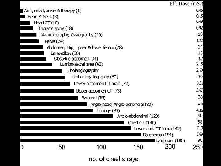 GSD p 185 • GENETICALY SIGNIFICANT DOSE • Takes all of the population into account • Annual AVERAGE gonadal dose to population of childbearing age • 0. 20 m. Sv • rem or rad? ? ? or 20 millirem