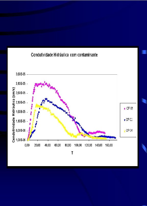 Procedimento - 4 CP (L = 10 cm, f = 5 cm) - GC = 95%, -Tensão de confinamento: 50 k. Pa - Gradientes: 7 cm/cm e 13 cm/cm. - CP saturados com água destilada até ser atingida vazão de saída constante - Substituição da água pela solução contaminante.