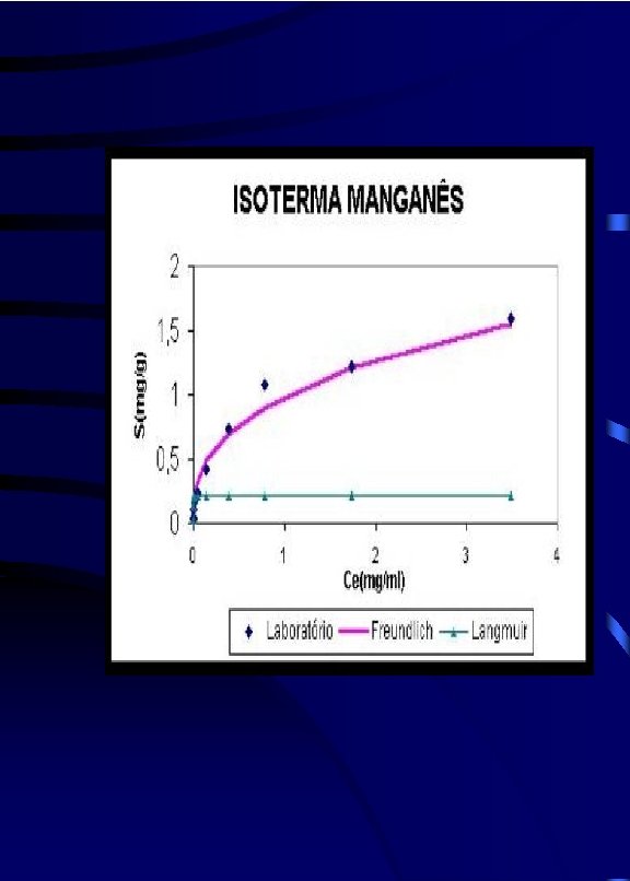 ISOTERMAS DE SORÇÃO - curvas de massa de soluto adsorvida/massa de solo seco vs. concentração de equilíbrio do soluto na solução. - podem assumir formas diversas: lineares e não lineares. - equações teóricas são usualmente empregadas para ajustar as isotermas obtidas experimentalmente (ex: Freundlich e Langmuir)