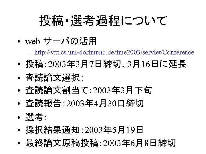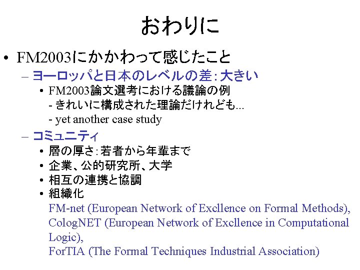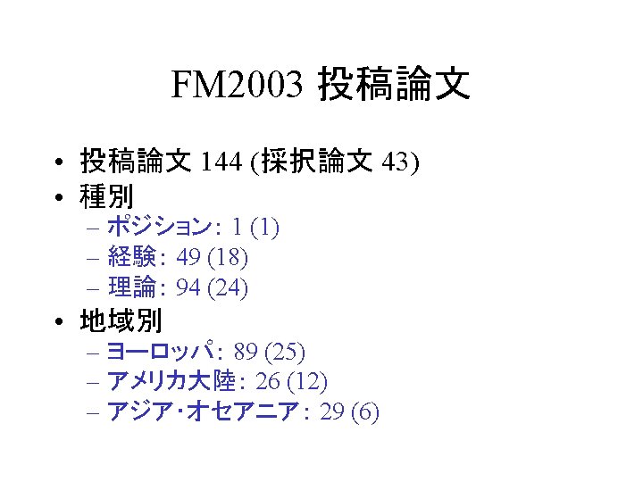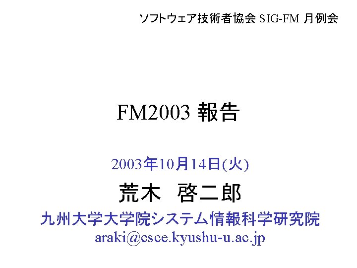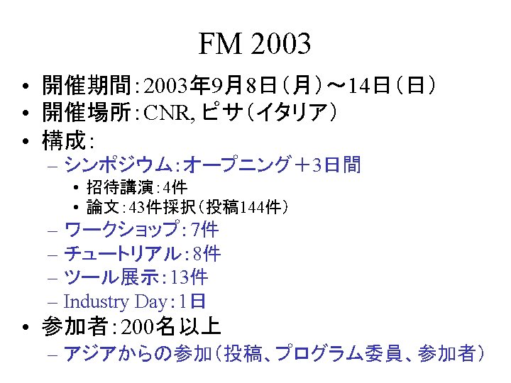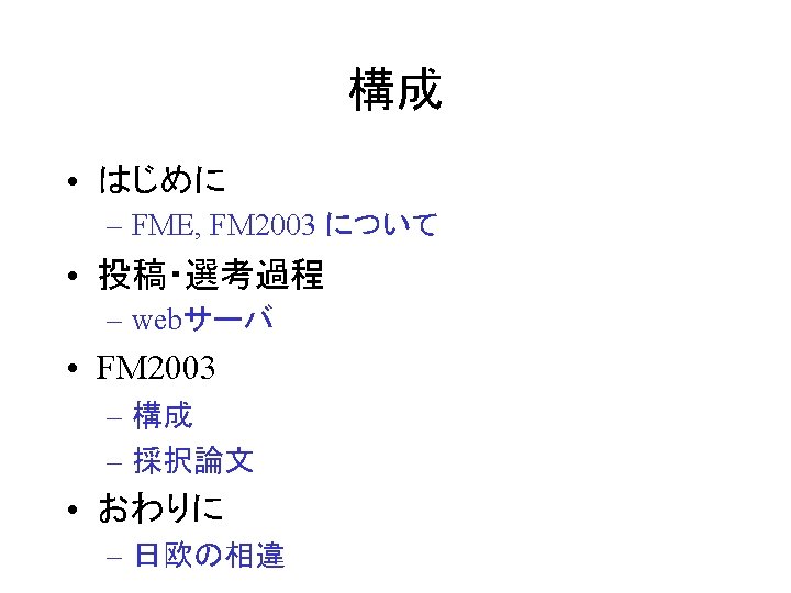 はじめに • FM 2003 – The 12 th International FME Symposium • FME: Formal Methods Europe – http: //www. fmeurope. org/ • International FME Symposia – VDM’ 87, VDM’ 88, VDM’ 90, VDM’ 91, FME’ 93, FME’ 94, FME’ 96, FME’ 97, FM’ 99, FME 2001, FME 2002, FM 2003 – Lecture Notes in Computer Science, Springer-Verlag