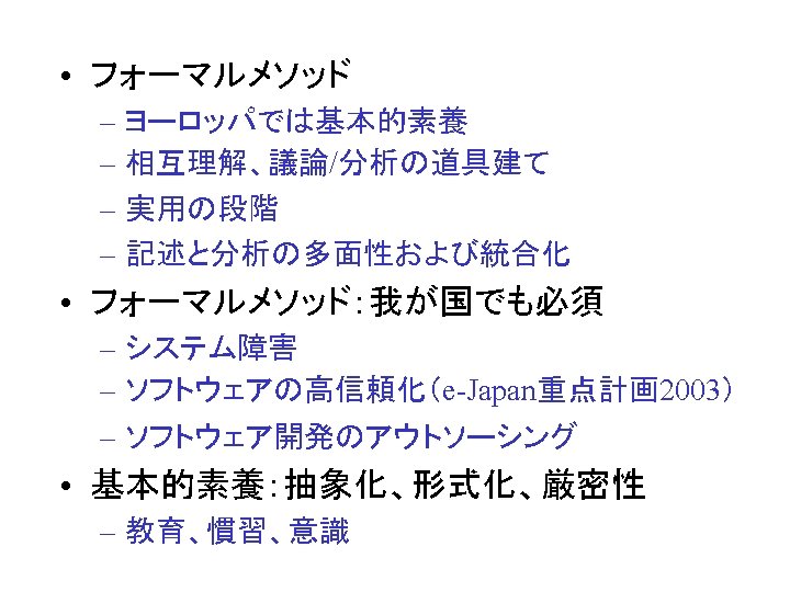• J. A. Hall: Seven Myths of Formal Methods, IEEE Software, Vol. 7, No. 5, pp. 11 -19, 1990. • J. P. Bowen and M. G. Hinchey: Seven More Myths of Formal Methods, IEEE Software, Vol. 12, No. 4, pp. 3441, 1995. • J. P. Bowen and M. G. Hinchey: Ten Commandments of Formal Methods, IEEE Computer, Vol. 28, No. 4, pp. 56 -63, 1995. • Araki, K. : Are Formal Methods Relevant? - How to Explode the Seven Myths in Japan -, Proc. 1995 Asia. Pacific Software Engineering Conference, p p. 514 -515, 1995. • Araki, K. and Chang, H. -M. : Formal Methods in Japan: Current State, Problems and Challenge, VDM Workshop 2002, July 2002.