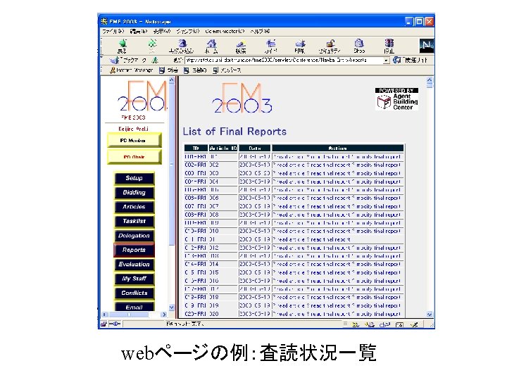 招待講演 • Kouichi Kishida (SRA Key Tech. Lab. ): Looking Back to the Future --- Thoughts on Paradigm Shift in Software Development • Brian Randell (Univ. of Newcastle): On Failures and Faults • Gerard Holzmann (NASA/JPL): Trends in Software Verification • Jean Raymond Abrial (Independent Consultant): Event based Sequence Program Development: Application to Constructing a Pointer Program