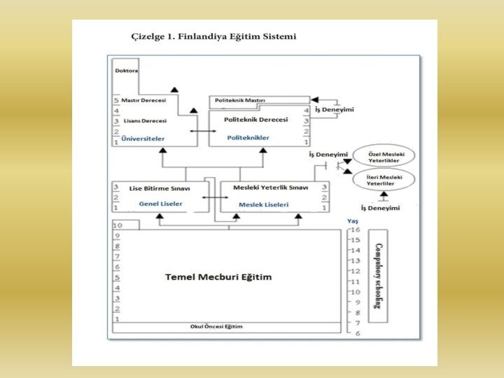 OKUL SİSTEMİNİN YAPISI-EĞİTİM BASAMAKLARI Bilimsel Yüksek Lisans Doktora derecesi Yüksek Lisans Derecesi ÜNİVERSİTELER 4 YIL Üniversiteye Giriş Sınavı II. DEVRE GENEL ORTAÖĞRETİM 3 YIL Mezuniyet Sonrası Meslek Yüksekokulu Derecesi MESLEK YÜKSEKOKULLARI 4 YIL Profesyonel Özellik II. DEVRE MESLEKİ ORTAÖĞRETİM 3 YIL I. DEVRE ORTAÖĞRETİM 3 YIL İLKÖĞRETİM-TEMEL ÖĞRETİM 6 YIL OKUL ÖNCESİ EĞİTİM